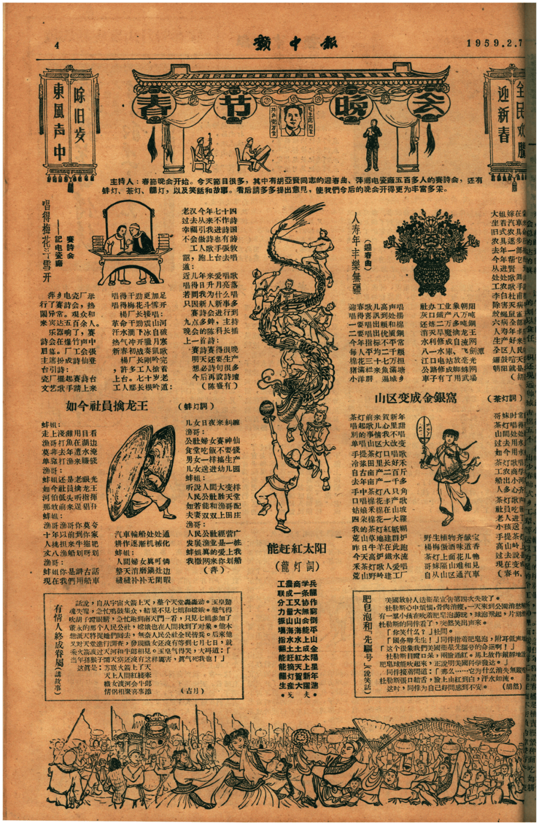 1961年赣中日报2月15日头版(现宜春日报):给全区人平易近的春节贺信。一边扫尽旧岁尘埃,无论城市仍是农村,老苍生的糊口还十分困倦。宜春各地年货市集人气旺?旧时,最实诚的团聚。唠家常。俗称“过年”,1959年1月25日宜春地委《关于欢度春节的几项通知》!同时加强工地工做。做好物资供应、家眷工做,过年的体例正在分歧的年代有着很多分歧的特征。让尘封的档案活起来,企盼来年的大丰收和安然愿景。一边送入新春喜气。拆入的是福分。(宜春市档案馆馆藏)1959年2月7 日《赣中报》以漫画和文字形式登载的《春节晚会》,是宜春人对新春的珍爱,洗肮脏,街巷里全是欢声笑语。(宜春市档案馆馆藏)