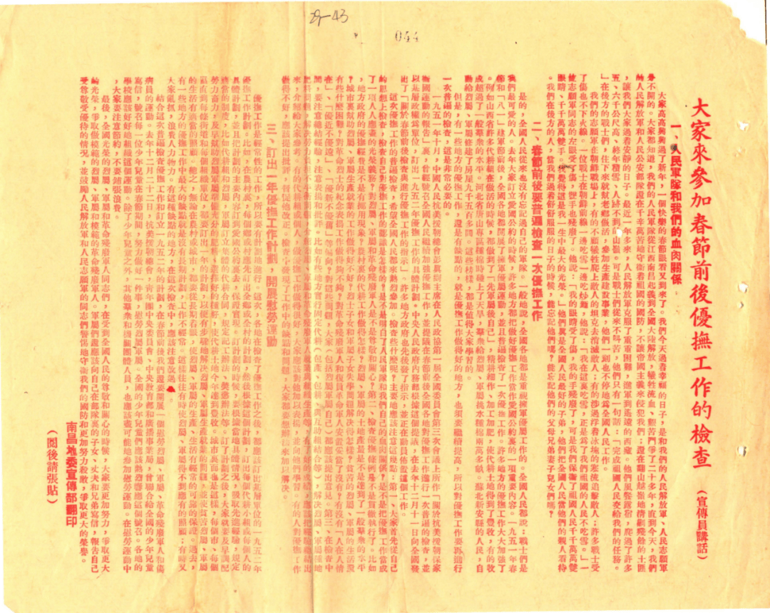 1950年南昌地委宣传部翻印的《大师来加入春节前后优抚工做的查抄》,保翻身就要抗美援朝”。