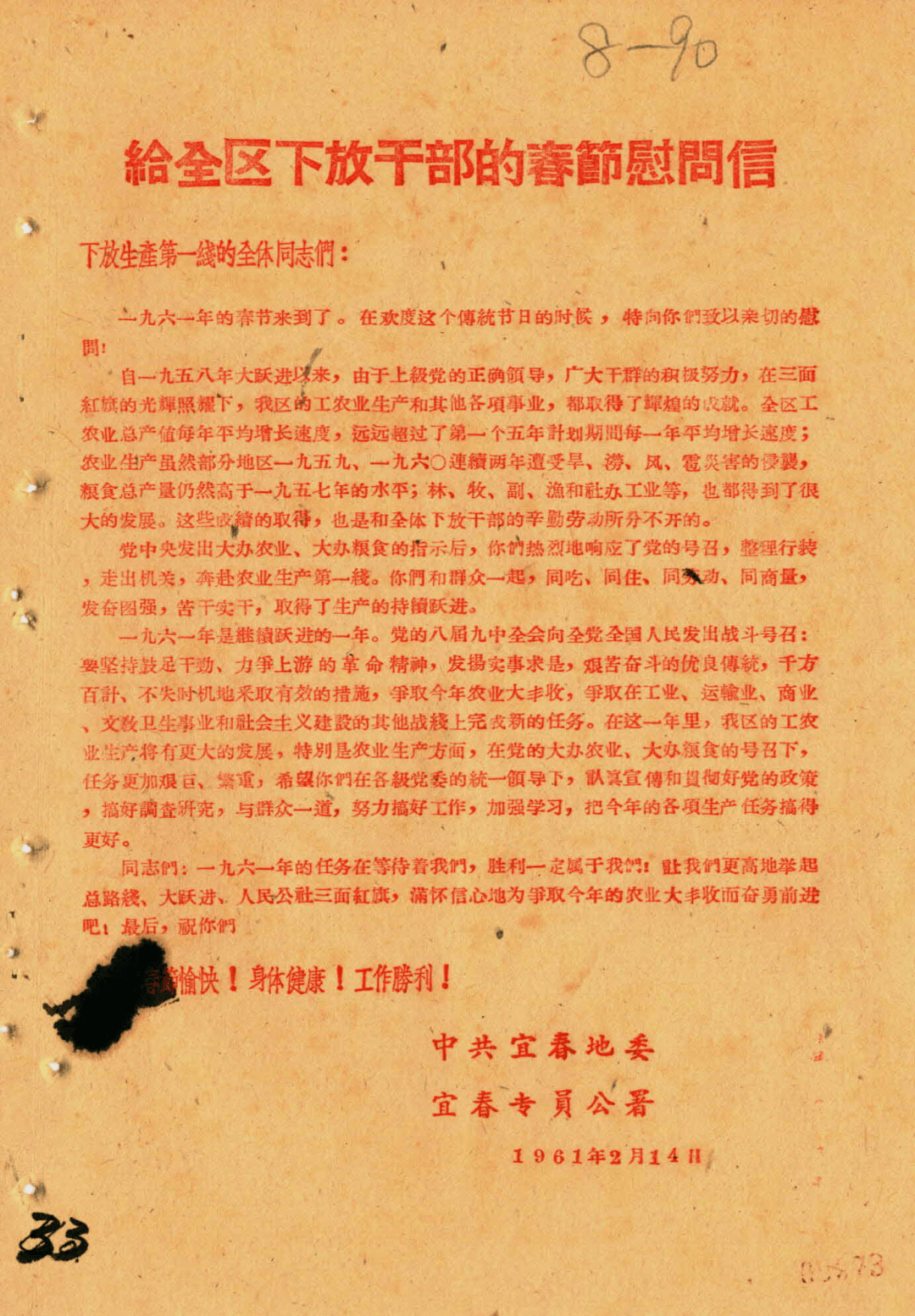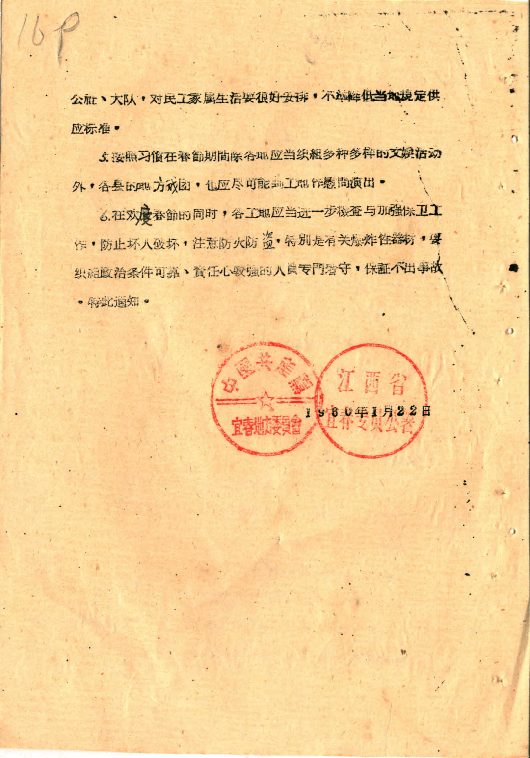1960年1月22日宜春处所委员会 江西省宜春专属《关于春节期间做好慰问平易近工和工地放置的通知》,(宜春市档案馆馆藏)
