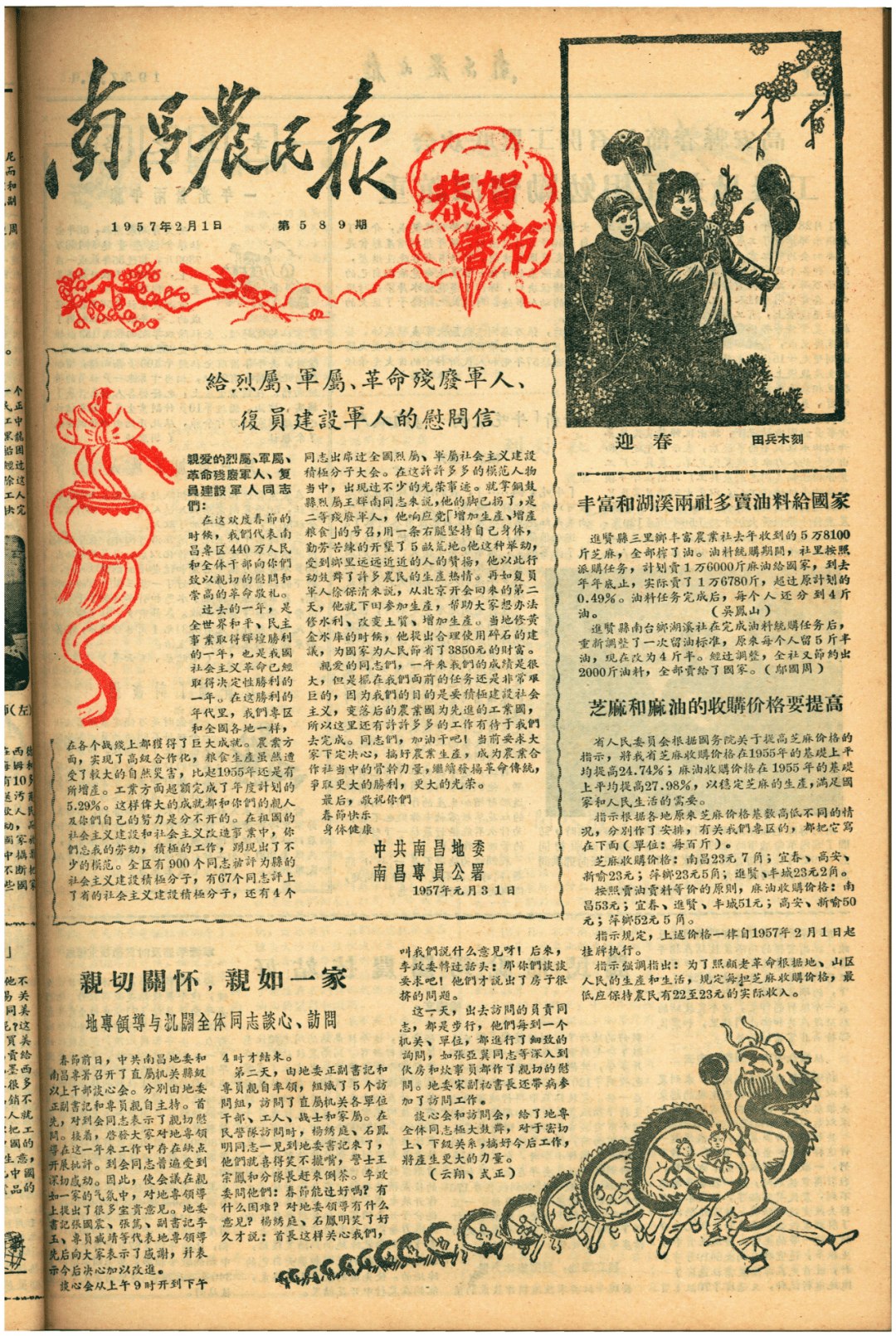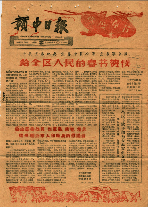 这一段喜庆光阴,有联春更浓”,引见了人平易近戎行和我们的血肉联系,先给家中长辈贺年,吃团年饭。南昌专区440万人平易近和全体干部向烈属、军属、残废甲士、回复复兴扶植甲士同志们致以亲热的慰问?(宜春市档案馆馆藏)