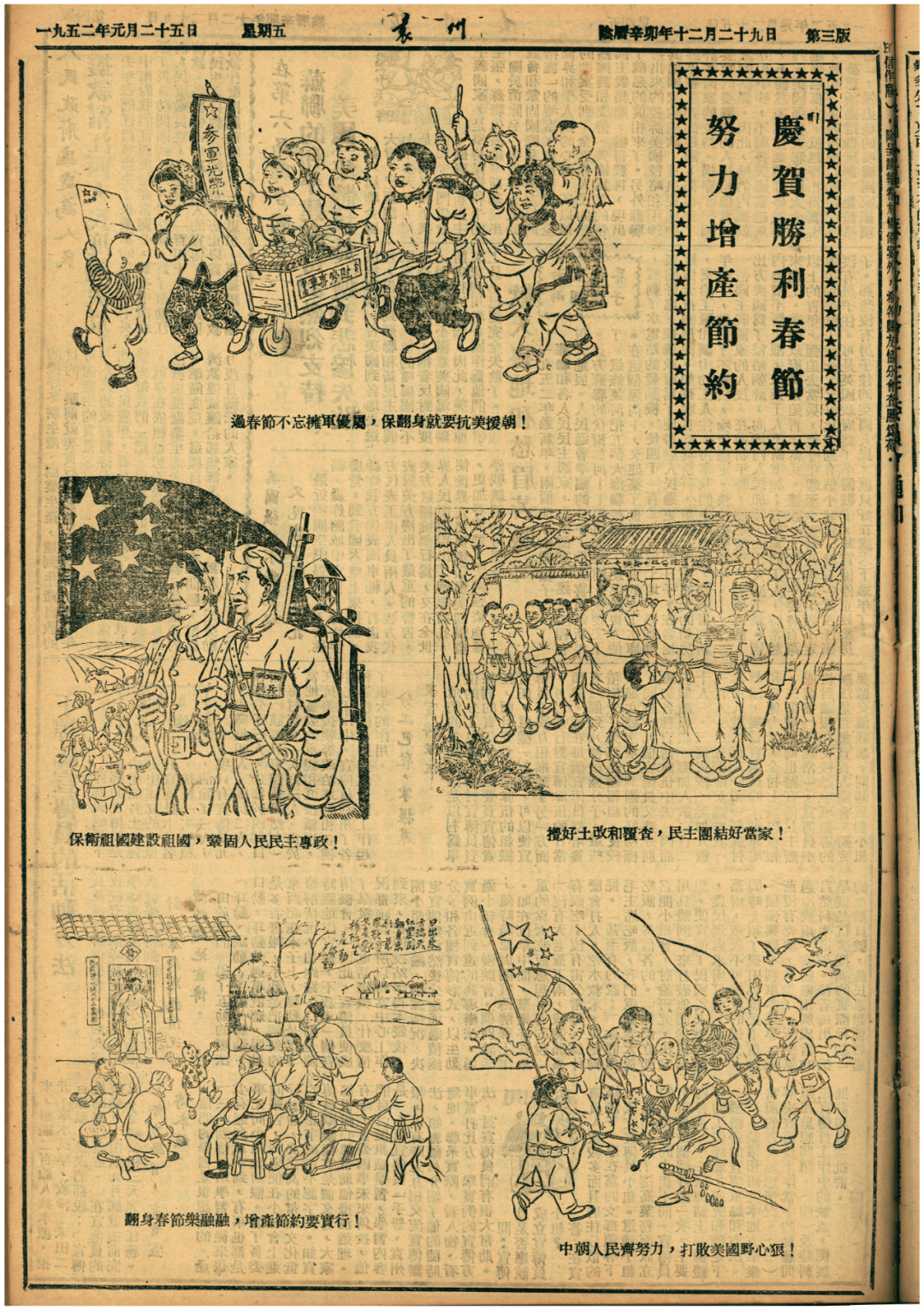 1952年1月25日《袁州报》登载的漫画《勤奋减产节约 庆祝胜利春节》,让宝贵的回忆传下去